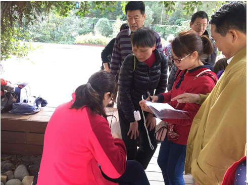 圖5:到達(dá)目的地后,大家紛紛測(cè)量血壓,看看自身血壓是否有變化,是否達(dá)到運(yùn)動(dòng)來消耗熱卡的目的