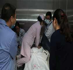 演練于當天下午三點揭開帷幕。運行的電梯突然發(fā)生墜梯現(xiàn)象,電梯內(nèi)的陪檢醫(yī)護人員立即向水電班、科室發(fā)出求救信號,告知被困電梯,同時安撫患者,此時,一名危重患者突發(fā)心跳驟停,電梯內(nèi)林建珍醫(yī)生朱穎護士立即爭分奪秒的搶救,整個過程醫(yī)護人員沉著冷靜,配合默契。電梯外的病區(qū)護士長接到求救電話后,一邊刻不容緩地通知護理部請求支援,一邊通知科室相關(guān)救援人員迅速到達現(xiàn)場對被困人員進行救援。護理部馬上部署,調(diào)度人力資源到現(xiàn)場施救。援救的醫(yī)護人員反應(yīng)迅速,在第一時間內(nèi)帶好搶救設(shè)備,在電梯口做好搶救工作的準備。通過大家的通力配合,7分鐘內(nèi)順利地將被困人員救出電梯,并送至病房進一步治療。