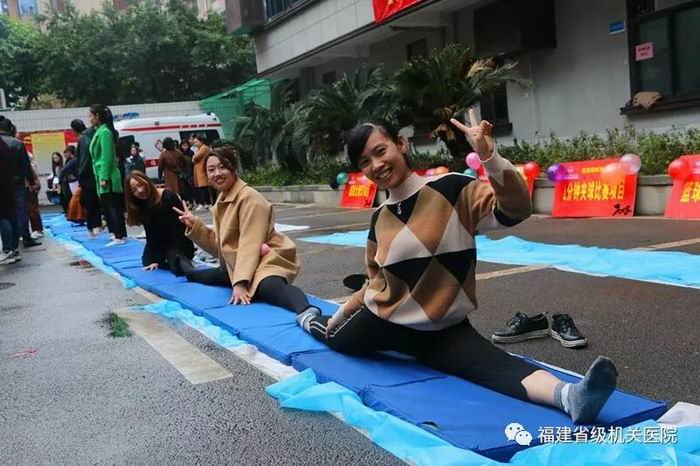 平時(shí)嚴(yán)謹(jǐn)?shù)尼t(yī)務(wù)人員此刻化身矯健的運(yùn)動(dòng)員,展現(xiàn)柔軟度,大秀一字馬。