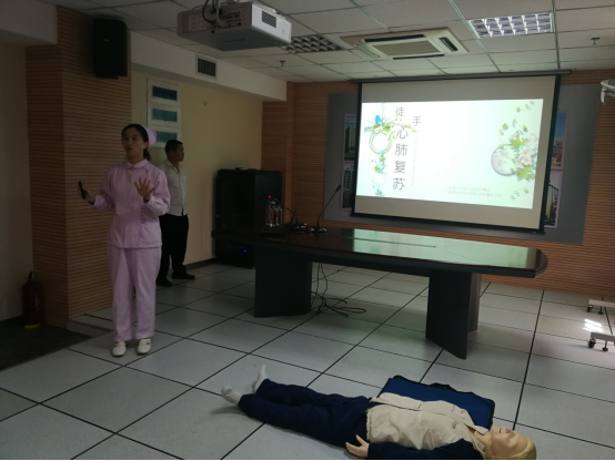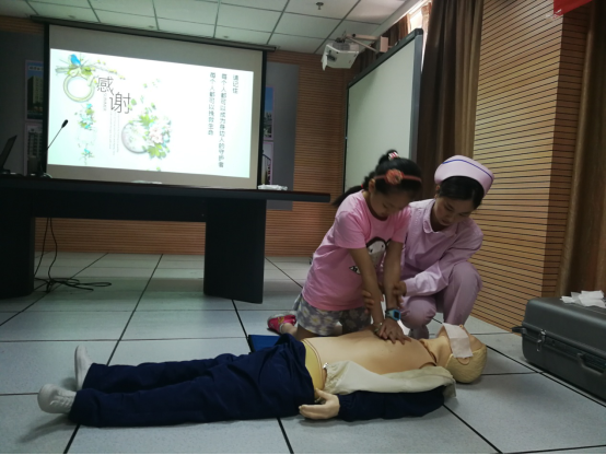 為了增加大家的積極性和感官效果,羅坤金、林彬兩位護(hù)士長自帶醫(yī)學(xué)模型和操作床墊,現(xiàn)場演練了CPR操作過程。演練結(jié)束后,所有小學(xué)員都躍躍欲試。通過兩位老師耐心細(xì)致的指導(dǎo)大家對(duì)心臟按壓的位置、深度、頻率及人工呼吸的方法都有了一定的了解。
