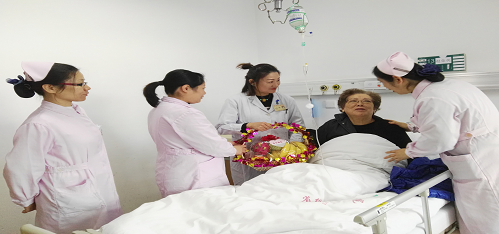 “李爺爺,生日快樂(lè)!”“祝李爺爺健康長(zhǎng)壽!”......”12月 12日,在這樣一個(gè)寒冷的冬季里、一股暖流悄悄涌入七區(qū)病房,一陣歡樂(lè)、悠揚(yáng)的生日快樂(lè)歌緩緩響起,原來(lái)今天是19床離休老干部,李老的 90大壽,病區(qū)全體醫(yī)護(hù)人員、病人家屬輕輕唱著生日歌,緩緩?fù)浦盏案猓踔r花,為他慶祝 90歲的生日。