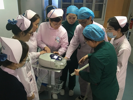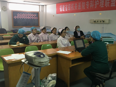 孫傳陽主管護(hù)師以我院常用的百帕VPAPIII ST-A QuickNav無創(chuàng)呼吸機(jī)為例,首先對無創(chuàng)呼吸機(jī)的原理、適應(yīng)癥、禁忌癥、上機(jī)操作程序、通氣模式的選擇、參數(shù)調(diào)節(jié)等進(jìn)行了詳細(xì)講解,接著對無創(chuàng)機(jī)械通氣操作進(jìn)行演示。孫護(hù)士強(qiáng)調(diào),正確的參數(shù)設(shè)置和有效的溝通可減輕患者的戴機(jī)恐懼、降低不適感,從而提高患者的治療依從性。培訓(xùn)后,大家對病房里使用無創(chuàng)呼吸機(jī)的參數(shù)設(shè)置提出問題并進(jìn)行討論。最后,通過考核讓大家加深了對此次培訓(xùn)知識的記憶。