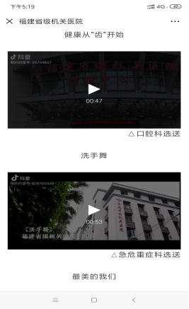 為增強(qiáng)護(hù)理團(tuán)隊(duì)的凝聚力和向心力,護(hù)理部和院團(tuán)委聯(lián)合舉辦“愛(ài)院、愛(ài)家、愛(ài)生活”抖音短視頻比賽,通過(guò)抖音短視頻展示護(hù)士日常工作、學(xué)習(xí)和生活的點(diǎn)點(diǎn)滴滴,展現(xiàn)我院護(hù)士良好的精神風(fēng)貌。此次活動(dòng),外科二樓《最美的我們》被評(píng)為最具影響力獎(jiǎng)、保健二區(qū)《護(hù)理一生,芳華依舊》、急危重癥科《洗手舞》被評(píng)為最佳創(chuàng)意獎(jiǎng);體檢中心《one day人員》、口腔中心《健康從齒開(kāi)始》、內(nèi)科一區(qū)《燃燒吧,青春--認(rèn)真工作,快樂(lè)生活》被評(píng)為最佳團(tuán)隊(duì)獎(jiǎng)。