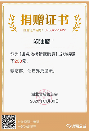 “小林,雖然現(xiàn)在年齡大了上不了前線,看到武漢一線醫(yī)護(hù)人員的奉獻(xiàn)付出,既心疼,又感動(dòng)。中央倡議黨員捐款支持抗擊疫情,我捐款200元,愿盡自己一份綿薄之力,你先幫忙代收下。”曾參加中國(guó)第9批援塞內(nèi)加爾共和國(guó)醫(yī)療隊(duì)的退休老黨員陳建華得知中央倡議黨員捐款,未等組織發(fā)動(dòng),第一時(shí)間來(lái)黨群辦表達(dá)了心系疫情防控,為國(guó)抗疫盡力的拳拳心意。