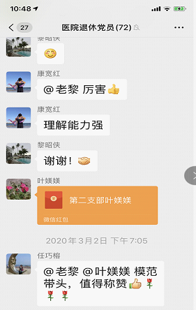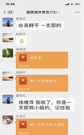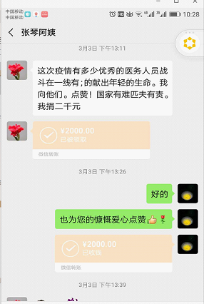 “這次疫情有多少優(yōu)秀的醫(yī)務(wù)人員戰(zhàn)斗在一線,有的獻(xiàn)出年輕的生命,我為他們點(diǎn)贊!國(guó)家有難匹夫有責(zé),我捐2000元?!边@是我院90歲高齡身處異地的離休黨支部張琴書(shū)記在微信里給黨群辦同志的留言,她隨即通過(guò)微信轉(zhuǎn)賬2000元,慷慨支持疫情防控。