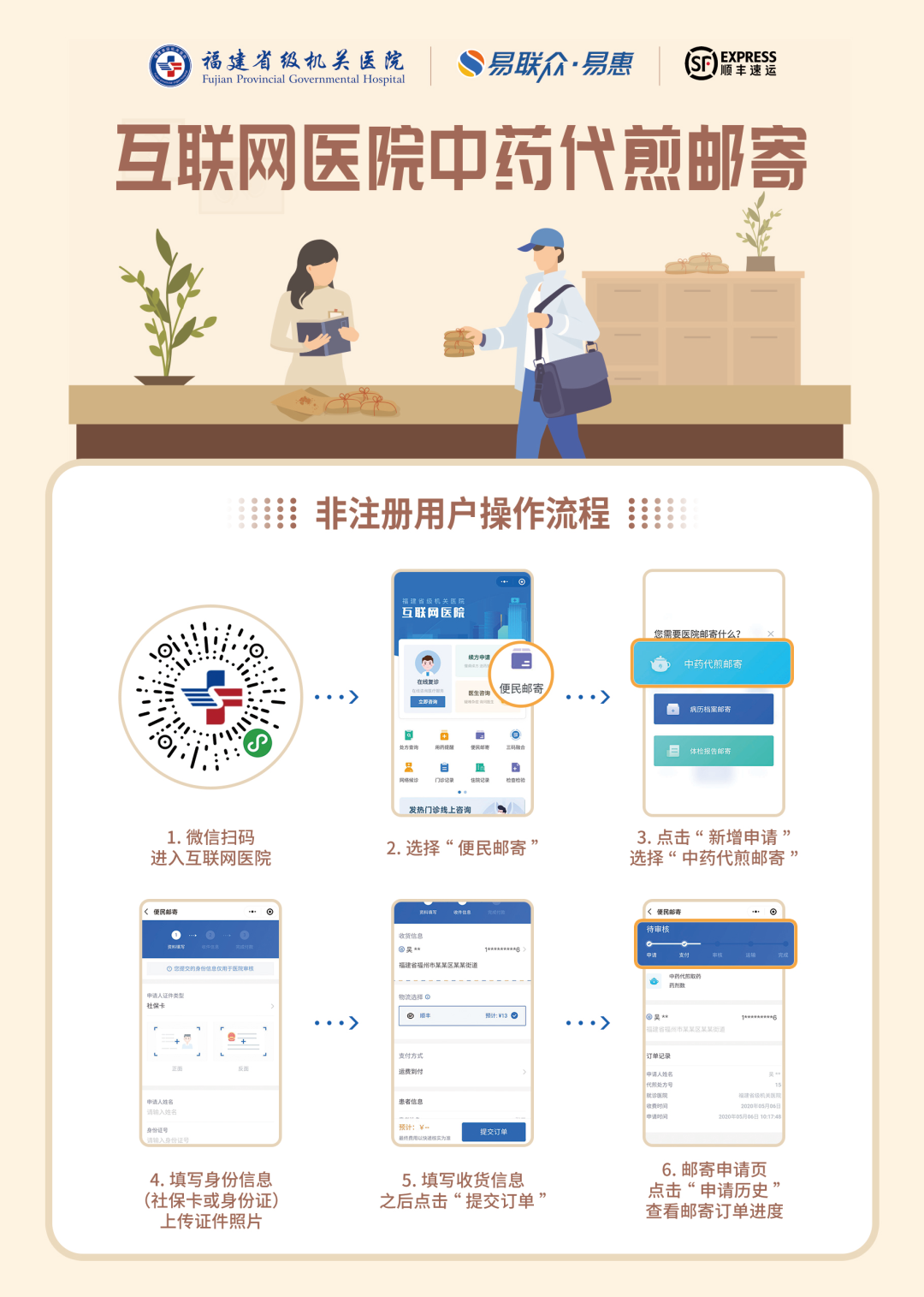 為進(jìn)一步方便患者就醫(yī),我院互聯(lián)網(wǎng)醫(yī)院上線“便民郵寄”服務(wù),病案復(fù)印、中藥代煎、體檢報告領(lǐng)取均可線上申請,郵寄到家,免跑腿、不等待!
