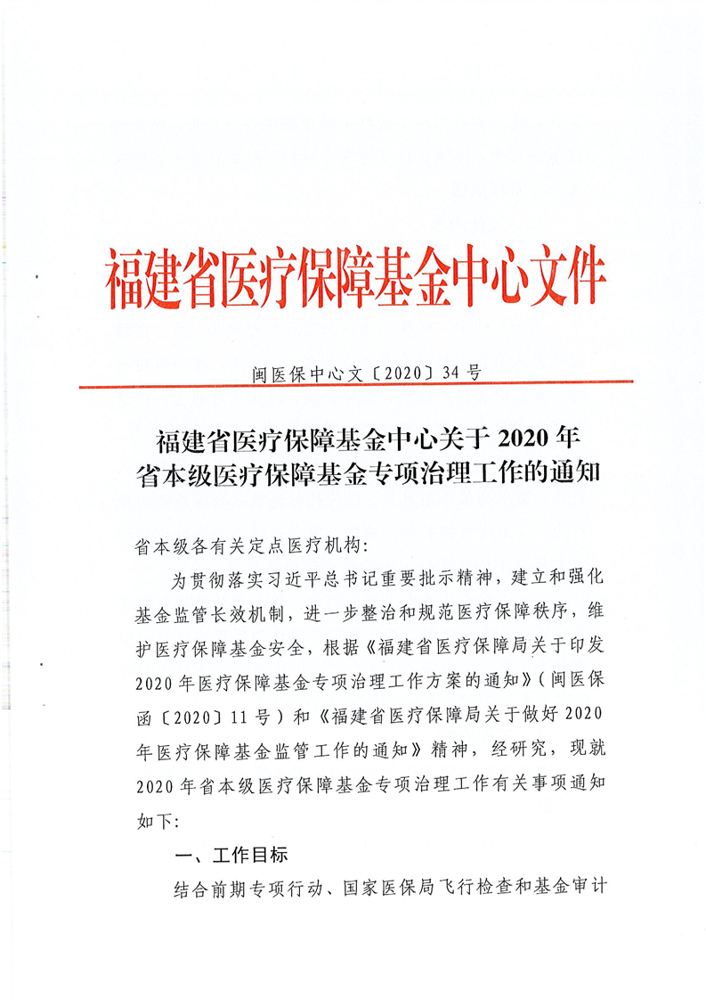 閩醫(yī)保中心文34號--關(guān)于2020年省本級醫(yī)療保障基金專項治理工作的通知