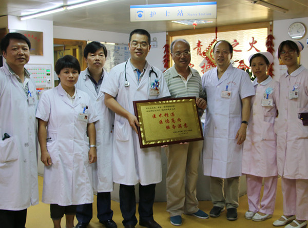 本報訊(內(nèi)一科:章文杰)6月30日下午,為表達感謝之情,一位90高齡生命垂危的患者在我院康復(fù)出院后,委派家屬親自將“醫(yī)術(shù)精湛、醫(yī)德高尚、服務(wù)滿意”的牌匾送到內(nèi)科一區(qū),并一一向內(nèi)科一區(qū)醫(yī)護人員表示致謝。