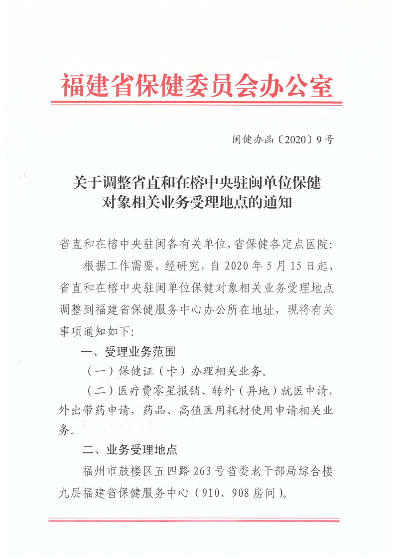 關(guān)于調(diào)整省直和在榕中央駐閩單位保健對象相關(guān)業(yè)務(wù)受理地點的通知