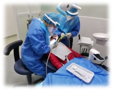 在診室醫(yī)護人員嚴格做好自己的防護措施:規(guī)范洗手、戴口罩、手套、護目鏡、面罩、穿隔離衣等。并且對接診的患者做好適當?shù)姆雷o。對于不同崗位的工作人員采取不同的防護措施。我們操作中同時使用強、弱吸引,減少飛沫、氣溶膠的產生,避免交叉感染。對所有患者在口腔診療前用0.5%過氧化氫溶液進行漱口,從而降低口腔操作產生的飛沫、氣溶膠中的微生物數(shù)量。