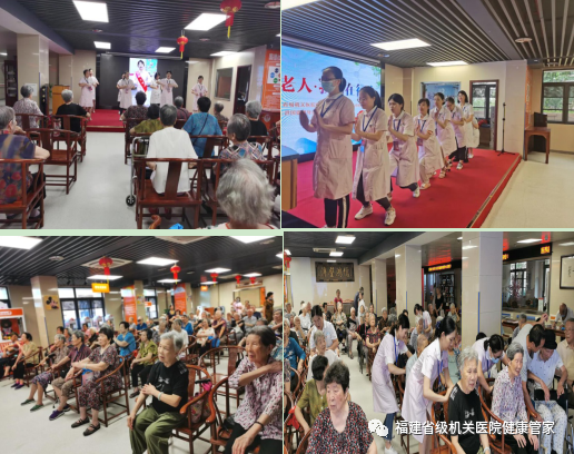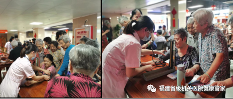 拍打操結(jié)束后,福建省級機(jī)關(guān)醫(yī)院護(hù)理專科小組在活動(dòng)大廳為園區(qū)長者進(jìn)行測血壓、專業(yè)拍背按摩及一對一護(hù)理知識健康宣教等。