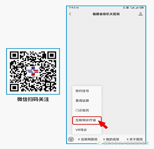 方式二:微信掃描下方二維碼,關(guān)注“福建省級(jí)機(jī)關(guān)醫(yī)院”微信公眾號(hào),之后點(diǎn)擊“互聯(lián)網(wǎng)醫(yī)院—互聯(lián)網(wǎng)診療端”,進(jìn)入互聯(lián)網(wǎng)醫(yī)院。