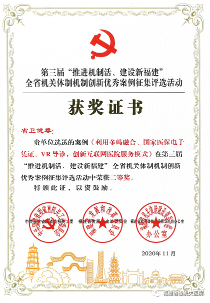 2020年7月15日,《利用多碼融合、國(guó)家醫(yī)保電子憑證、VR導(dǎo)診,創(chuàng)新互聯(lián)網(wǎng)醫(yī)院服務(wù)模式》案例上報(bào)省直工委開(kāi)展的第三屆“推進(jìn)機(jī)制活、建設(shè)新福建”全省機(jī)關(guān)體制機(jī)制創(chuàng)新優(yōu)秀案例,并獲二等獎(jiǎng)。