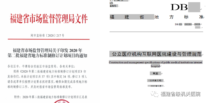 2020年8月10日,“公立醫(yī)療機(jī)構(gòu)互聯(lián)網(wǎng)醫(yī)院建設(shè)及管理規(guī)范”入選2020年福建省地方標(biāo)準(zhǔn)。