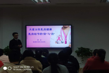 活動現(xiàn)場,乳腺外科曹熹主治醫(yī)師用豐富的專業(yè)知識和臨床經(jīng)驗對女性乳腺疾病危險因素、居家自查、常見乳房疾病的預(yù)防和防治等方面知識進行了生動、詳細地講解,并現(xiàn)場示范居家自查方法和現(xiàn)場女性朋友們進行科普互動。講座后,醫(yī)護人員還現(xiàn)場發(fā)放精心制作的健康宣教資料,免費測血壓、測血糖,提供現(xiàn)場健康咨詢,使大家了解了乳腺疾病,提高了預(yù)防的意識,為提高乳腺癌早期診斷、早期治療起到了積極作用。