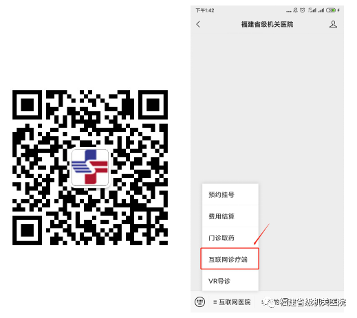 方式二:微信掃碼關(guān)注“福建省級機(jī)關(guān)醫(yī)院”微信公眾號,點擊底部菜單欄“互聯(lián)網(wǎng)醫(yī)院—互聯(lián)網(wǎng)診療端”進(jìn)入互聯(lián)網(wǎng)醫(yī)院。