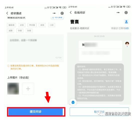 根據(jù)自身情況,進(jìn)行癥狀描述后提交問診,之后等待醫(yī)生接診。