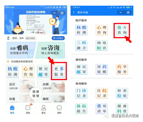 醫(yī)生在線接診,同時開具在線處方。問診結(jié)束后,患者可在首頁“更多服務(wù)—處方查詢”查看在線處方。