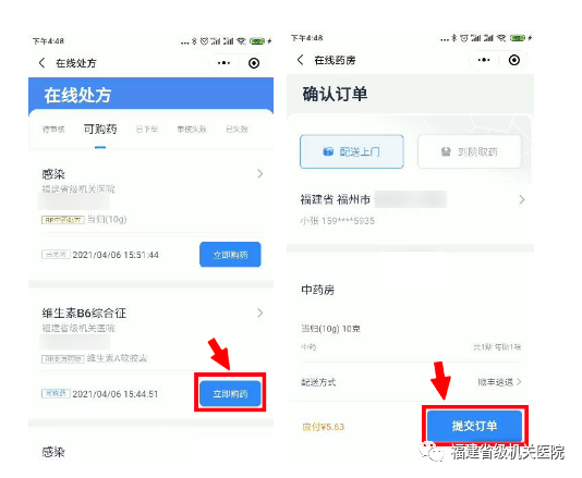 選擇可購藥處方,并點擊“立即購藥”,之后點擊“提交訂單”。