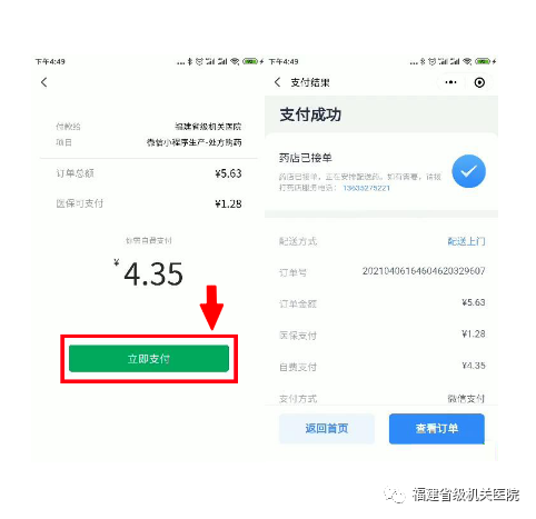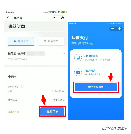 人臉識別通過后,點擊“提交訂單”,選擇“前往醫(yī)保結(jié)算”,并點擊“立即支付”,之后即可成功完成醫(yī)保在線結(jié)算。
