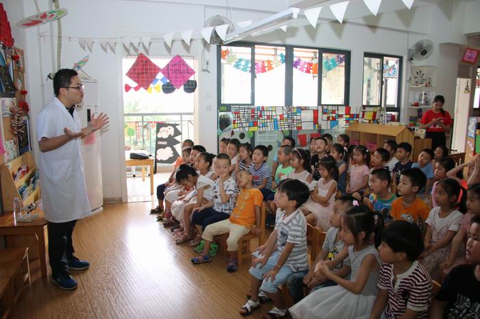 “如果小朋友每天吵鬧著要一直看電視,以后就會(huì)向叔叔一樣戴眼鏡咯!所以每天看動(dòng)畫(huà)片的時(shí)間不能超過(guò)半小時(shí),比如看大家喜歡看的《小豬佩奇》動(dòng)畫(huà)片,最多只能看兩集,知道了嗎?”林泰南十分生動(dòng)活潑的“兒語(yǔ)”讓小朋友一下就接受了淺顯易懂的愛(ài)眼知識(shí),教室里不時(shí)傳出孩子們齊聲回答的稚嫩童聲。