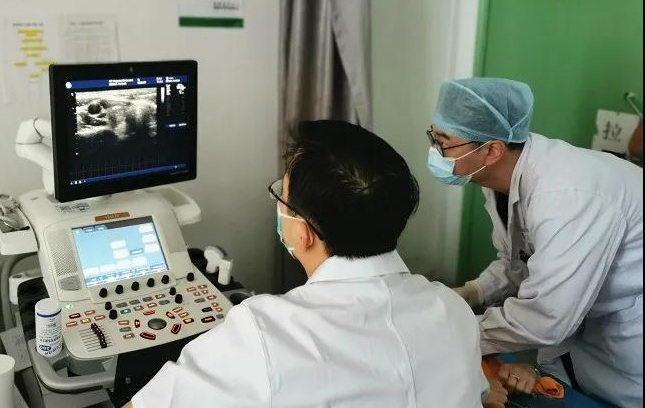 超聲科技術(shù)幫扶。超聲檢查是初步評估甲狀腺、乳腺等結(jié)節(jié)的首選影像學(xué)檢查方法。但某些結(jié)節(jié)在超聲影像學(xué)表現(xiàn)上具有一定風(fēng)險(xiǎn),在充分考慮患者的病史和臨床危險(xiǎn)因素的基礎(chǔ)上,可能需要進(jìn)行細(xì)針穿刺活檢(FNA)進(jìn)一步明確診斷。根據(jù)患者就醫(yī)需求,2021年6月9日我院邀請省立醫(yī)院吳松松主任醫(yī)師蒞臨指導(dǎo)開展甲狀腺、乳腺穿刺手術(shù)示教,如今我院超聲科已成功開展超聲引導(dǎo)下淺表腫物穿刺術(shù)(甲狀腺、乳腺,淺表淋巴結(jié)等),積極推進(jìn)超聲介入醫(yī)聯(lián)體合作。