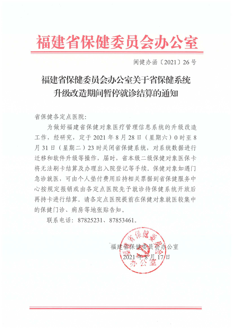 關于省保健系統(tǒng)升級改造期間暫停就診結算的通知