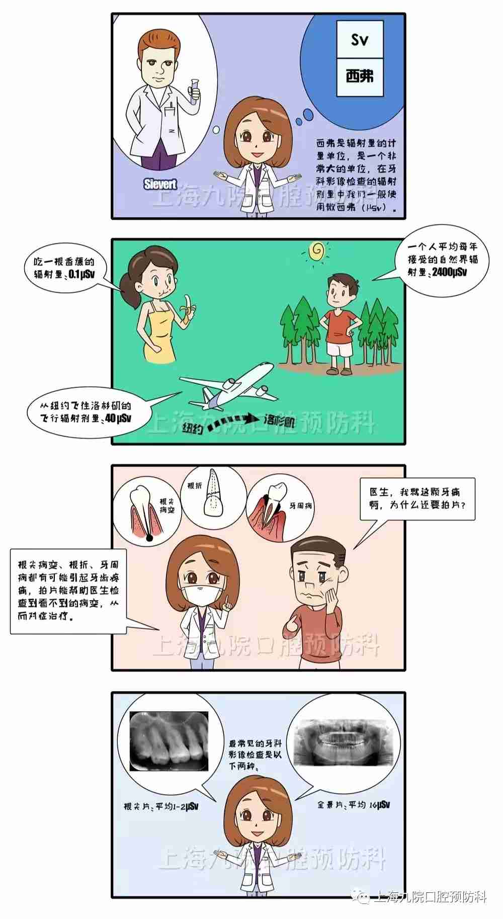 口腔放射檢查中,最常用的就是X線根尖片(牙片)和曲面斷層片(全景片)。拍一次牙片的輻射劑量約5-10微西弗,拍一次全景的輻射劑量在10-20微西弗左右,如此推算,每人每年至少可以接受近200張牙片,100張全景片的輻射量。況且,在每日5-50微西弗的劑量率下,即使長期照射累積很大劑量也只導(dǎo)致慢性放射損傷,而不會產(chǎn)生急性放射病的癥狀。對于輻射致癌問題,目前國內(nèi)外尚未有確切定論。