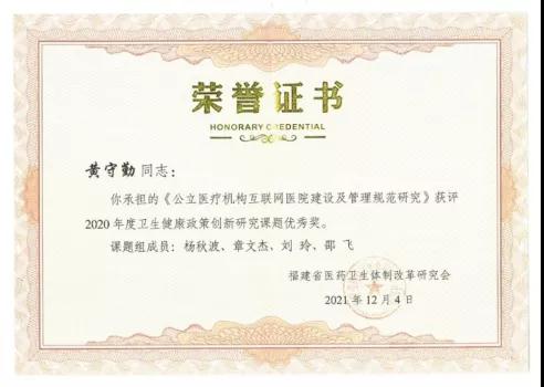 2021年12月4日,2020年衛(wèi)生健康創(chuàng)新課題優(yōu)秀獎名單公布,由福建省級機(jī)關(guān)醫(yī)院領(lǐng)銜承擔(dān)的《公立醫(yī)療機(jī)構(gòu)互聯(lián)網(wǎng)醫(yī)院建設(shè)及管理規(guī)范研究》從眾多參選課題中脫穎而出,榮膺“2020年衛(wèi)生健康創(chuàng)新課題優(yōu)秀獎”。此次獲獎,充分彰顯我院醫(yī)改工作成效,更體現(xiàn)專業(yè)人士對我院醫(yī)改應(yīng)用和創(chuàng)新做法的認(rèn)可。