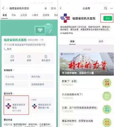 方式二:市民可通過(guò)微信搜索“福建省級(jí)機(jī)關(guān)醫(yī)院”,然后關(guān)注醫(yī)院公眾號(hào)。