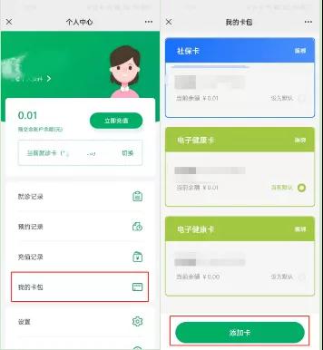 二、因線上社保卡信息未同步更新,也讓許多市民無(wú)法進(jìn)行線上充值、檢查檢驗(yàn)報(bào)告查詢(xún)等服務(wù)。為方便市民就醫(yī),享受第三代社??ǖ谋憬莘?wù),我院開(kāi)通線上添加三代卡服務(wù),具體操作如下:
