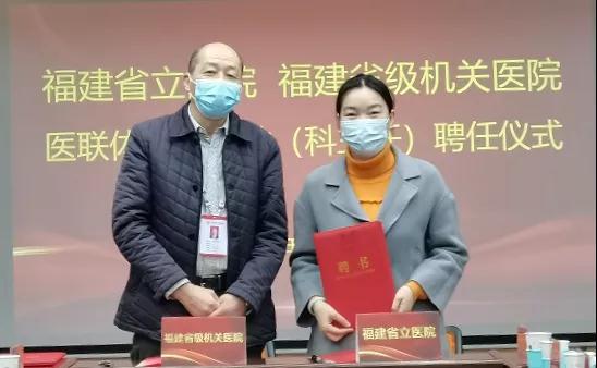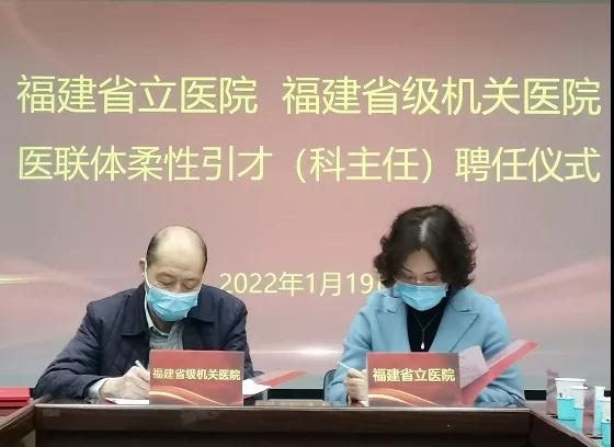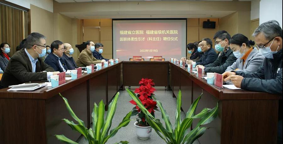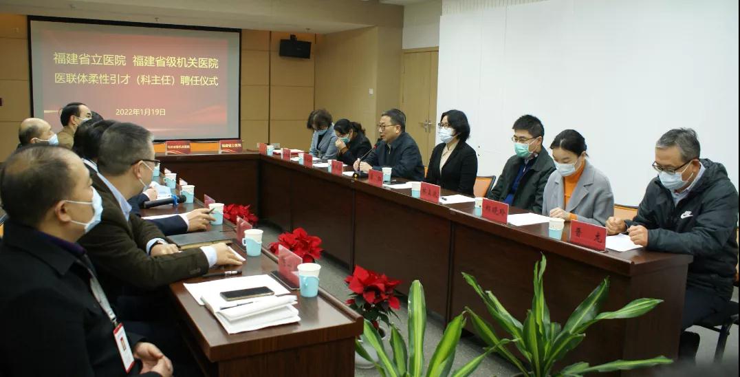 1月19日下午,福建省立醫(yī)院-福建省級機(jī)關(guān)醫(yī)院醫(yī)聯(lián)體柔性引才(科主任)聘任儀式在我院口腔中心三樓會議室舉行。省立醫(yī)院黨委書記、院長朱鵬立、黨委副書記、金山醫(yī)院黨委書記李紅、副院長郭延松、醫(yī)務(wù)部主任林孟波、組織部部長王秋蓉、主任醫(yī)師、博士生導(dǎo)師鄭曉玲、主任技師陳金花、主任醫(yī)師晉龍及我院黨政領(lǐng)導(dǎo)班子、相關(guān)科室成員參加,聘任儀式由黨委書記黃守勤主持。
