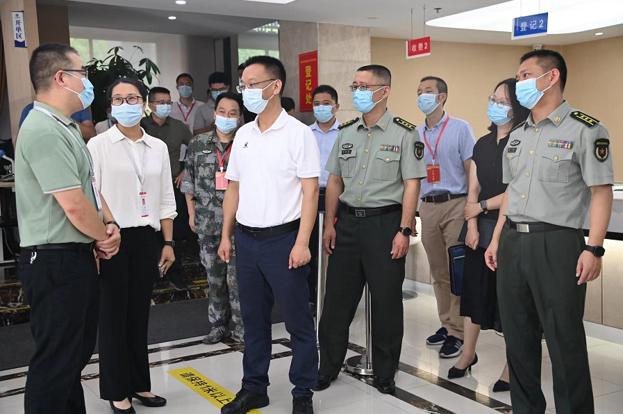 8月11日上午,鼓樓區(qū)征兵領(lǐng)導小組組長、區(qū)長楊輝,區(qū)人武部部長金磊、政委沈曉銘一行蒞臨我院視察征兵體檢工作,副院長(主持行政工作)章文杰及相關(guān)科室負責人陪同檢查。