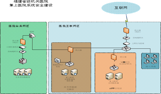 然而掌上醫(yī)院系統(tǒng)在幫助患者便捷就醫(yī)的同時,也給醫(yī)院內(nèi)網(wǎng)系統(tǒng)帶來了前所未有的風(fēng)險(xiǎn)與挑戰(zhàn),內(nèi)外網(wǎng)數(shù)據(jù)交互的安全性尤為重要。在此過程中,醫(yī)院必須嚴(yán)格防范病毒的感染或者黑客的入侵,否則輕者數(shù)據(jù)被盜取或損壞,重者系統(tǒng)癱瘓。我院結(jié)合了網(wǎng)絡(luò)安全性現(xiàn)狀,構(gòu)建了掌上系統(tǒng)網(wǎng)絡(luò)拓?fù)淙鐖D所示,不僅在外網(wǎng)設(shè)置了防火墻、防病毒網(wǎng)關(guān)等硬件設(shè)備進(jìn)行了有效防范,而且在內(nèi)外網(wǎng)對接處設(shè)置網(wǎng)閘、防火墻、入侵防御系統(tǒng)、防病毒網(wǎng)關(guān)進(jìn)行多層防護(hù),從而保證終端用戶和內(nèi)網(wǎng)系統(tǒng)的數(shù)據(jù)安全。