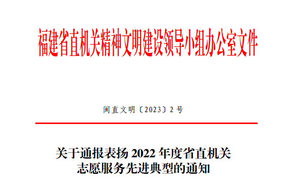 近日,福建省直機(jī)關(guān)文明辦發(fā)布《關(guān)于通報(bào)表?yè)P(yáng)2022年度省直機(jī)關(guān)志愿服務(wù)先進(jìn)典型的通知》,徐光輝榮獲2022年度省直機(jī)關(guān)“最美志愿者”稱(chēng)號(hào)。