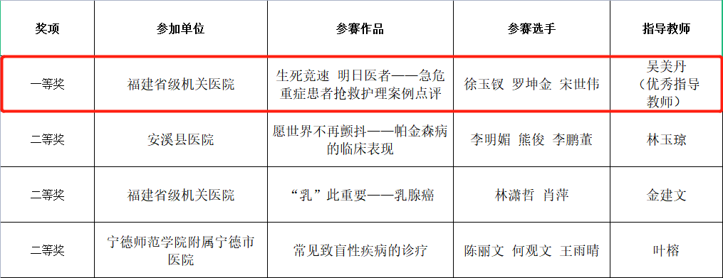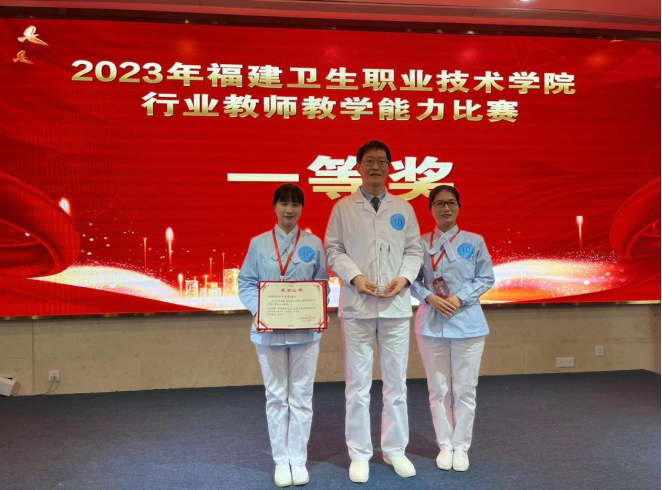 日前,由福建衛(wèi)生職業(yè)技術(shù)學(xué)院舉辦的“2023年行業(yè)教師教學(xué)能力比賽”決賽落下帷幕,我院由徐玉釵、羅坤金、宋世偉三位老師組成的參賽團(tuán)隊作品《生死競速、明日醫(yī)者》,從13支參賽隊伍中脫穎而出,最后以96.1分的總成績斬獲 “一等獎”。