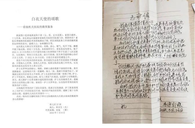 提起護理員,來自南平84歲的黃依伯一家也是贊不絕口。黃依伯轉(zhuǎn)院到省級機關(guān)醫(yī)院時,護理員已經(jīng)等候在醫(yī)院門口,用輪椅將他推進醫(yī)院,幫忙提東西,跑上跑下辦理入院手續(xù)?!胺?wù)專業(yè)周到。老人的身體有細微變化,都能察覺到,并第一時間向醫(yī)生護士反應(yīng)。有他們在,我們做子女的很放心!”黃依伯出院時,家屬給醫(yī)護人員和護理員留下一封長長的感謝信。