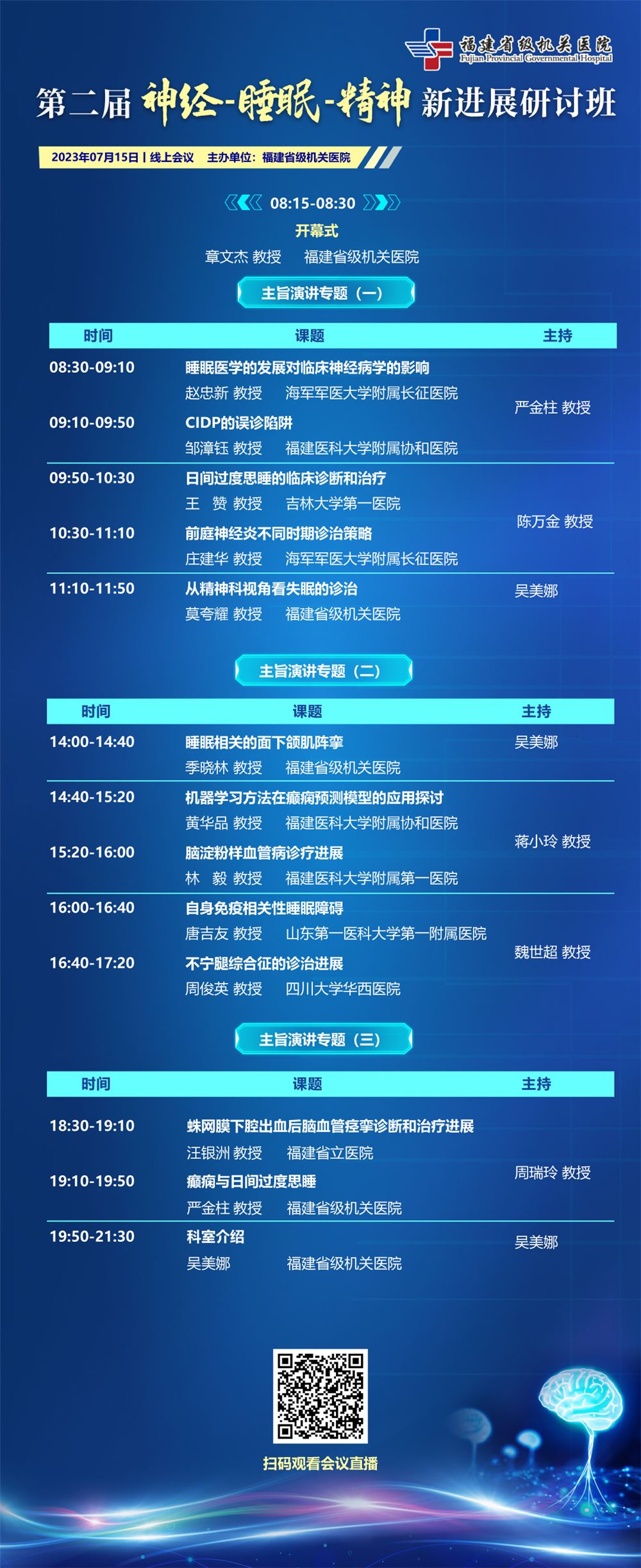本次活動邀請了來自省內(nèi)外神經(jīng)內(nèi)科、睡眠醫(yī)學(xué)、精神心理等相關(guān)領(lǐng)域的知名專家,圍繞目前神經(jīng)-睡眠-精神的學(xué)術(shù)進(jìn)展及熱點(diǎn)作專題授課。研討班吸引一百多位學(xué)員學(xué)習(xí),瀏覽量達(dá)2200多人次。