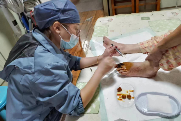 巡診中,醫(yī)護(hù)人員會(huì)為老人測(cè)量血壓、血氧及血糖情況,為糖尿病患者糖尿病足進(jìn)行換藥,為一些子女不在身邊的特殊老人提供送藥服務(wù),并根據(jù)實(shí)際情況調(diào)整用藥方案,提升藥物治療效果。