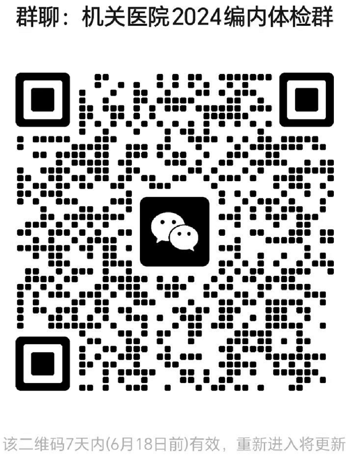 為確保本次機關(guān)醫(yī)院2024編內(nèi)體檢工作的順利進(jìn)行,方便我們及時與您溝通相關(guān)事宜,請您掃描下方二維碼加入“機關(guān)醫(yī)院2024編內(nèi)體檢群”。