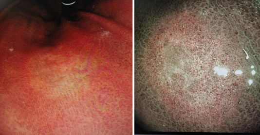憑借豐富的操作經(jīng)驗(yàn),他覺(jué)得這片淺凹陷灶很有蹊蹺:根據(jù)粘膜病變的特點(diǎn),顏色發(fā)生改變,另外結(jié)合所處的位置特殊,位于這里也是容易發(fā)生一些特殊疾病的地方,在胃體下段出現(xiàn)這種淺凹陷灶要高度重視。
