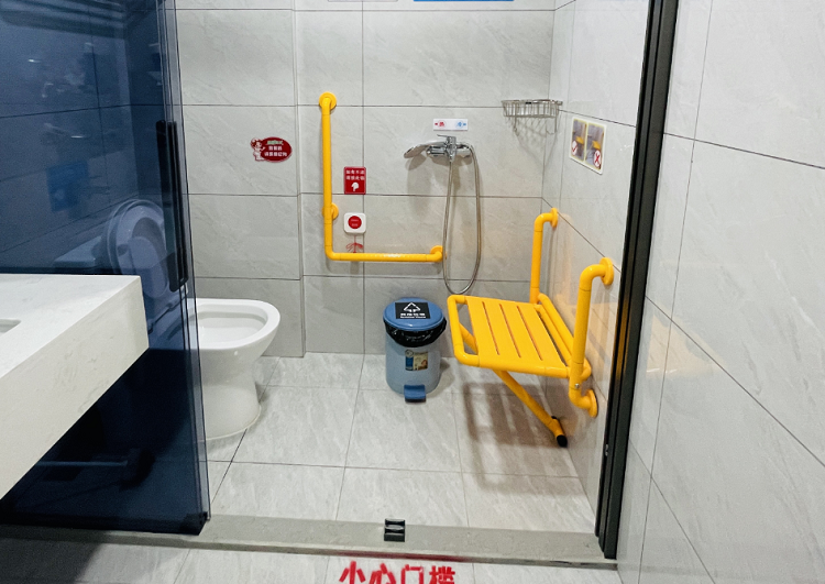 衛(wèi)生間設(shè)置了坐式淋浴裝置,馬桶一側(cè)的墻上還安裝了扶手,以及緊急呼叫鈴,高度確保老人坐在馬桶上、淋浴時(shí),伸手就能按到。