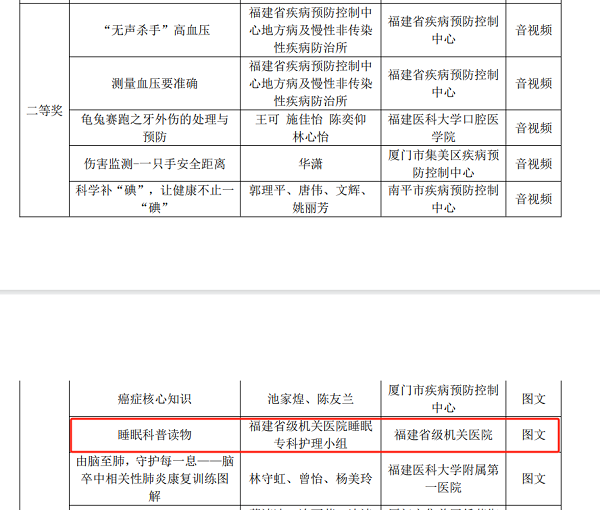 近日,在福建省疾病預(yù)防控制中心舉辦的2024中國健康科普大賽(福建賽區(qū))中,我院睡眠??谱o理小組憑借精心策劃并制作的圖文繪本——《睡眠科普讀本》,繼入圍2024年新時代健康科普作品征集大賽(福建省賽區(qū))圖文類名單后再次脫穎而出,榮獲二等獎。