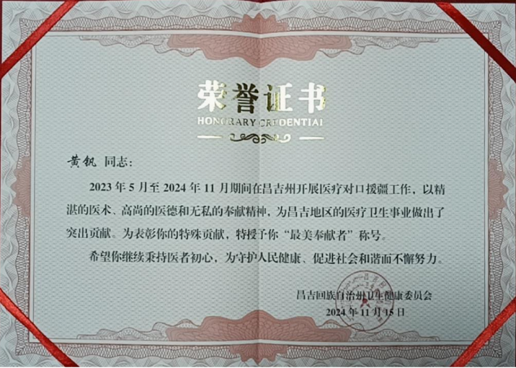 漫漫援疆路,濃濃援疆情。黃釩同志的努力和付出得到了當?shù)卣?、醫(yī)院醫(yī)護人員和患者的認可,榮獲“最美奉獻者”等榮譽稱號。