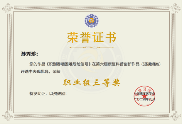 康復(fù)科孫秀珍醫(yī)生的“識別吞咽困難危險(xiǎn)信號”科普視頻獲第六屆全國康復(fù)科普創(chuàng)新作品(短視頻類)職業(yè)組三等獎(jiǎng)。