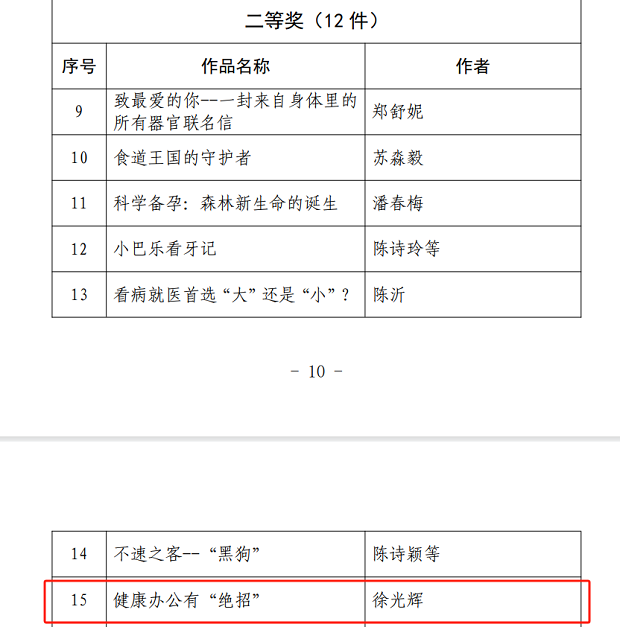 外科徐光輝科普文章《健康辦公有“絕招”》獲第三屆福建省科普作品創(chuàng)作大賽二等獎(jiǎng)。