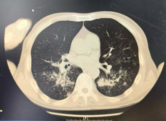 重癥醫(yī)學(xué)科林捷主任帶領(lǐng)科室醫(yī)護(hù)團(tuán)隊(duì)立即給予呼吸循環(huán)支持、容量管理、臟器功能保護(hù)等治療,并進(jìn)行床旁重癥超聲檢查評(píng)估心肺功能等。抽血結(jié)果顯示:血?dú)夥治鎏崾狙鹾现笖?shù)僅114mmHg(低于300提示存在呼吸衰竭),血乳酸3.49mmoL/L,白細(xì)胞高達(dá)20.9×109/L 。CT 提示:雙肺大片炎癥伴肺水腫。