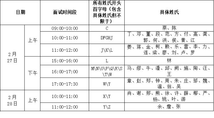 1.如2月27日上午9點到10點時間段,所有姓氏開頭為“C”的考生均可到現(xiàn)場參加面試;