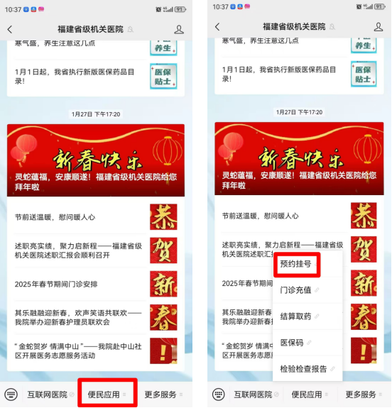 2.點擊底部菜單欄“便民應(yīng)用”,之后點擊“預(yù)約掛號”