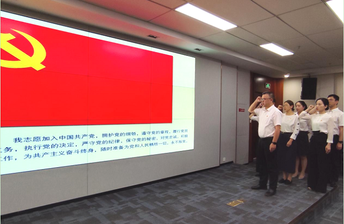 黨委副書記(主持工作)、院長章文杰為新發(fā)展黨員佩戴黨徽,囑咐他們牢記黨員身份責(zé)任,不忘初心使命,忠誠履職盡責(zé),時(shí)刻以黨員的標(biāo)準(zhǔn)嚴(yán)格自省、始終保持昂揚(yáng)干勁、踏實(shí)做好本職工作。黨旗下,章文杰帶領(lǐng)全體黨員重溫入黨誓詞,全體黨員面向黨旗高舉右臂,莊嚴(yán)宣誓,錚錚誓言彰顯初心如磐,堅(jiān)定為共產(chǎn)主義和人民衛(wèi)生健康事業(yè)奮斗終身的決心。